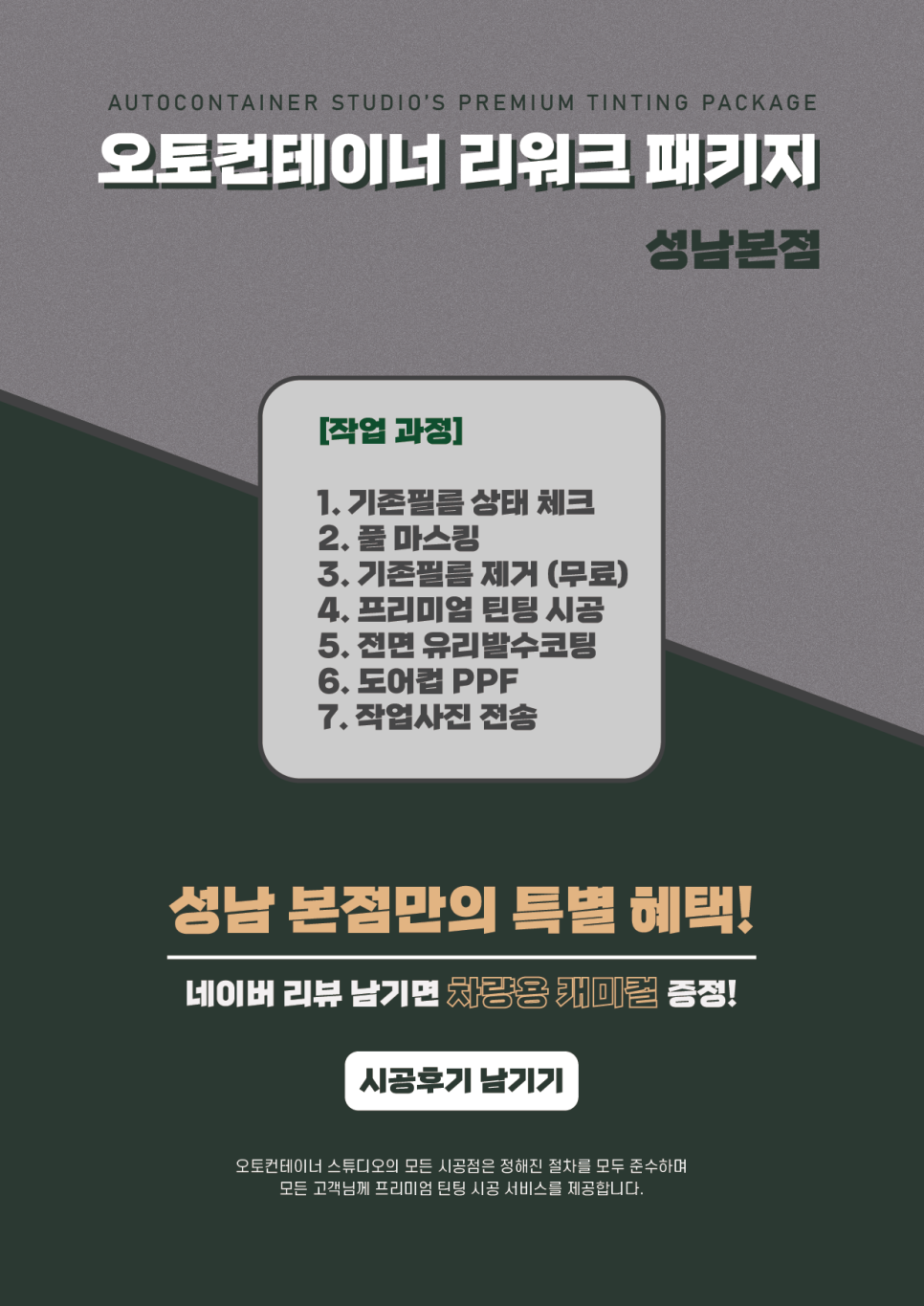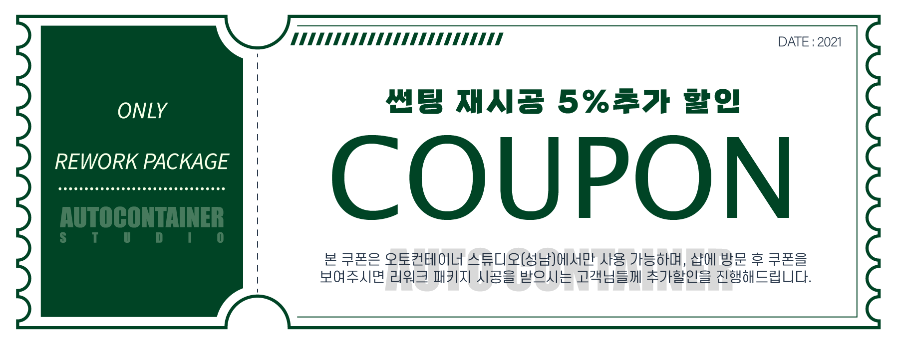 썬팅은 신차를 구매했을 때만 하는 것이다? 아닙니다. 보통 신차를 출고 받고 난 후 차량에 썬팅이 되어 있지 않기 때문에 딜러에게 맡기거나 썬팅샵에서 직접 시공을 받기도 하는데요. 썬팅 재시공만으로도 새로운 차량의 느낌을 낼 수 있습니다. 중고차를 샀는데 썬팅 농도가 내게 맞지 않는 경우, 그리고 시공후 필름 벗겨짐이나 오랜 시간이 지나 색이 바랜 경우 썬팅 재시공이 필요합니다. 오토컨테이너 스튜디오는 기존 필름을 제거하는 비용을 따로 받지 않고 있으며, 최대한 열선 손상없이 필름 제거후에 썬팅 재시공 작업을 해드리고 있습니다. *썬팅 재시공 5% 추가할인 쿠폰* 카카오채널 추가하신 후에 쿠폰을 다운 받아보세요!