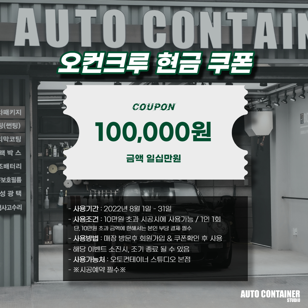 위 쿠폰은 오토컨테이너 스튜디오 본점에서만 사용이 가능하시고 무조건 10만원 초과 시공하시는 경우 10만원이 차감되는 시크릿 쿠폰입니다.